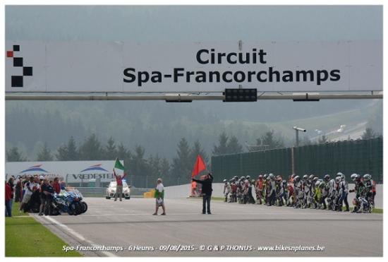 Lors des 2 tours de chauffe, je vois que la piste est mouillée du Raidillon jusqu'à Fagnes (1/3 du circuit). Je suis en pneus secs, comme la majorité des pilotes mais certain sont en pneus pluie. Ça va être un sacré bazar ! Kiko me tiens la moto. Je suis de l'autre côté de la piste et je m’apprête à courir jusqu'à ma moto pour le départ : c'est un vrai départ de course d'endurance !