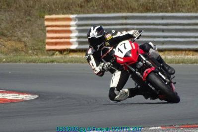 Je pars pour cette première session. Je roule en 2 ‘00 régulier… et en meilleur chrono ! Je n’ai pas du tout confiance dans le pneu arrière (D212 GP Racer en 160). Le circuit du Vigeant comporte beaucoup de virages serrés et le fait que le 160 ne soit pas large du tout et que son grip ne soit pas terrible ressort beaucoup sur ce circuit.